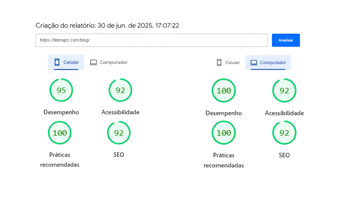 Basta colar o link do seu site e ela mostra notas de 0 a 100 para a versão mobile e desktop, além de apontar exatamente o que está lento: imagens pesadas, scripts mal otimizados, excesso de plugins, entre outros.